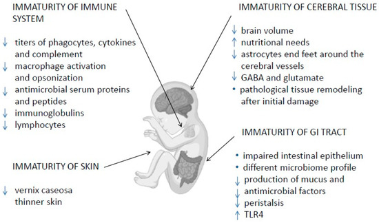 Immaturity of immune, gastrointestinal and nervous systems in very preterm neonates [13,14,15,16,17,18,19,20,21,22,23,24,25,26,27,28,29,30,31,32,33,34,35,36,37,38,39,40,41,42,43,44].