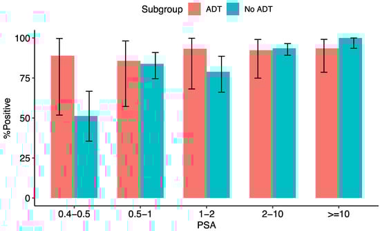 The proportion of positive scans in different PSA subgroups in patients with/without ongoing ADT at the time of PET/CT. Error bars represent 95% confidence interval.