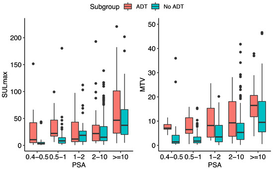 The sum of top five lesions’ SULmax and MTV in different PSA subgroups in patients with/without ongoing ADT at the time of PET/CT.