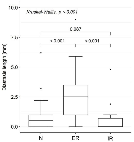 Diastasis length. A paired t-test was used to assess the significance of the difference between the diastasis length measured on MRA in the different positions (ER vs. N and ER vs. IR positions). The distribution of the diastasis length is displayed by boxplots.