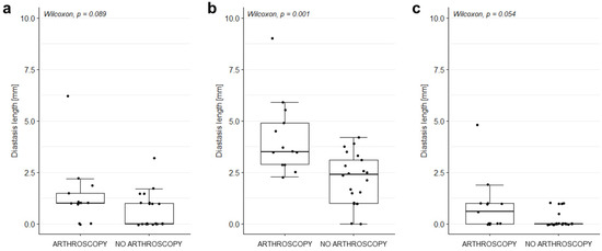 Diastasis length in patients who did and did not undergo arthroscopy. Diastasis length of SLAP lesions measured on MRA acquired in (a) N, (b) ER, and (c) IR position. Only cases with SLAP lesions (as diagnosed by Rater 1 based on the evaluation of the MRA acquired in ER position; n = 40) were considered.