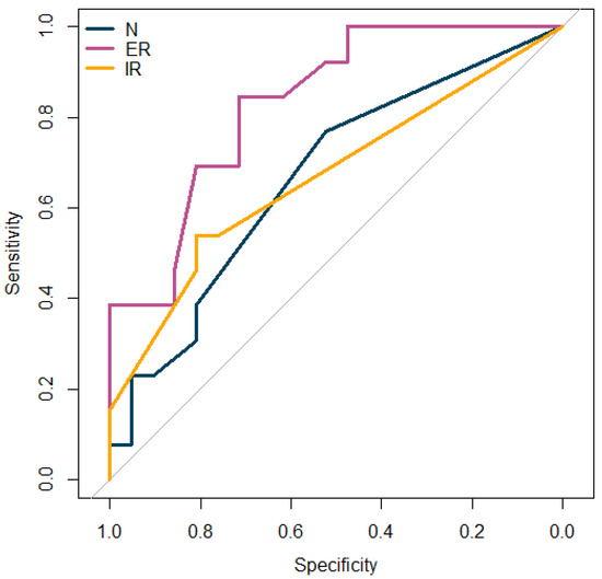 Diastasis length potential to assess the need for arthroscopy surgery. ROC curves showing the ability of diastasis length, measured on MRA acquired in the three shoulder positions (blue: N, purple: ER, orange: IR), to separate cases requiring and not requiring arthroscopy. Abbreviations: N = neutral position, ER = external rotation, IR = internal rotation.