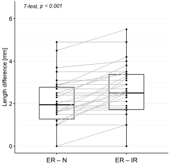 The difference between the diastasis lengths measured by Rater 1 in the ER and N positions was significantly lower than the difference between those measured on the images acquired in the ER and IR positions (median length = 1.9 [1.3–2.8] mm vs. 2.5 [1.7–3.4] mm, respectively; p < 0.001) (Figure 5).