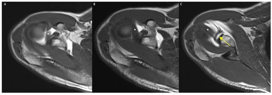 In a cadaveric study, Kwak et al. suggested that the position of the upper limb in the external rotation (ER) puts tension on the biceps–labrum complex and allows for a better evaluation of the lesions [6]. This result was later confirmed with an in vivo study by Jung et al., who evaluated the diagnostic accuracy of MR arthrography (MRA) in the detection of SLAP lesions between the neutral (N) and ER positions [7]. MRA is the gold standard technique for detecting SLAP lesions, but, alternatively, CT arthrography can be used, with the latter being almost equivalent to the former in SLAP diagnosis [8]. Of course, MRA is preferred to avoid radiation exposure and for its higher contrast resolution in soft tissues. To date, it is well-established that the position of the humeral head impacts the capsulolabral complex and must always be considered for a correct image interpretation [9]. However, no previous study has also assessed the performance of the internal rotation (IR) position of the upper limb in this setting. We decided to carry out this study to answer the following questions: (i) What is the added value of the multipositioning MRA protocol in SLAP diagnosis? (ii) What are the reliability and accuracy of the images acquired in the different shoulder positions? We expected to find higher diagnostic accuracy and inter-rater agreement when evaluating images in the ER position with progressive increases in the labrum diastasis length when moving from IR to N and then ER images. Thus, our study aimed to evaluate the diagnostic performance of the shoulder MRA acquired in the N, IR, and ER positions of the humeral head in the diagnosis of SLAP lesions.
