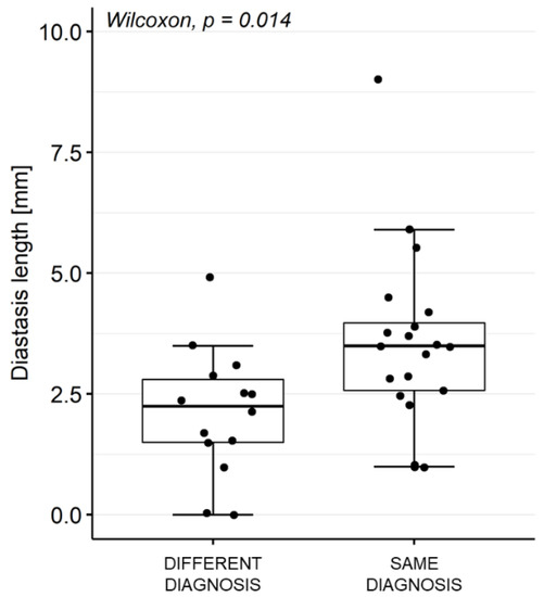 In these 19 cases, and after excluding type I lesions (n = 6), the diastasis length (measured by Rater 1 on the images acquired in the ER position) was significantly lower than in the 20 cases where the positive diagnosis was consistent across the images acquired in a different position (median length = 2.2 mm [1.5–2.8] vs. 3.5 mm [2.6–4.0], respectively; p = 0.014) (Figure 7).