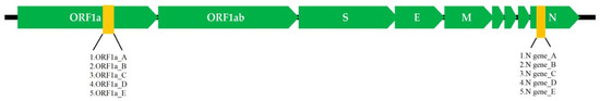 Illustration of SARS-CoV-2 genes. The diagram shows all genes presented in the virus genome. The ORF1a and N genes were targeted by the developed RT-LAMP assay, with five primers against each gene (A, B, C, D, and E) designed for that purpose.