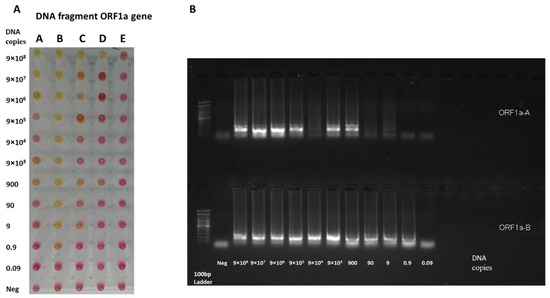 RT-LAMP assay on synthesized RNA molecules, showing (A) the RT-LAMP assay performed on synthesized RNA from the ORF1a gene and (B) the RT-LAMP assay performed on synthesized RNA from the N gene. The RNA molecules were serially diluted tenfold, and the reaction was incubated in the heat block at 65 °C for 30 min. The pink color indicated a negative reaction, while the yellow indicated a positive one. The RT-LAMP assay was highly sensitive as it detected 39 copies for ORF1a (primers A and B) and 25 copies for the N gene (primers A–D).