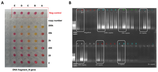 RT-LAMP sensitivity assay on N target using DNA samples. (A) The RT-LAMP assay was performed on DNA synthesized fragments. The assay was performed on five primer targets on the N gene (A, B, C, D, and E). The reaction was performed with serial dilution of the N fragment, starting from 200,000 to 2 copies. The reaction was incubated in a heat block at 65 °C for 30 min. (B) The gel electrophoresis for the A and B primer targets the N gene. The B primer set has demonstrated a high level of sensitivity to detect 200 copies of the DNA fragment of the N gene.