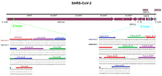 Comparison of the B target in the ORF1a and N gene of SARS-CoV-2 with similar regions in the SARS-CoV-1 genome. The Figure illustrates the location of the B target in the ORF1 and N gene of SARS-CoV-2, which blasted against the SARS-CoV-1 genome sequence. The primers that were used in the RT-LAMP assay were denoted.