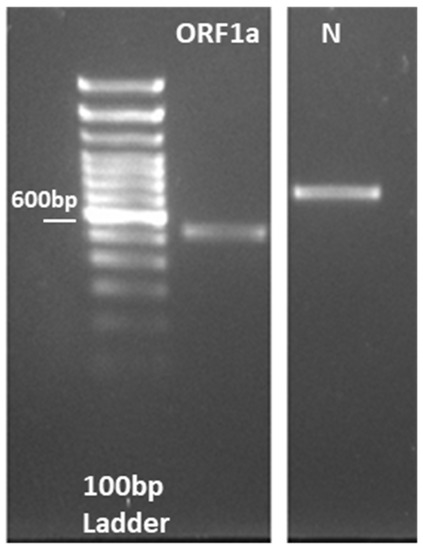 RNA synthesis by in vitro transcription, showing the gel electrophoresis for the PCR performed on ORF1a and N fragments where the T7 promoter sequence was added to the DNA fragment.