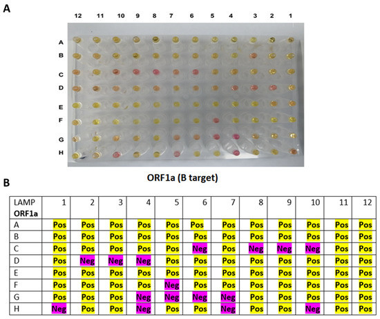 RT-LAMP assay on clinical RNA samples using primer targeting B region on the ORF1a gene. (A) The reaction results after incubation in a heat block at 65 °C for 30 min, in which the pink color indicated a negative reaction, while the yellow color denoted a positive reaction. (B) A table summarizing the RT-LAMP assay on the B target of the ORF1a gene. All of the positive samples with Cq values of <30 (n = 73) were detectable by 94.5% for the ORF1a gene using the RT-LAMP. The samples with Cq values of >30 were less sensitive to be detected by the RT-LAMP (47.8%).