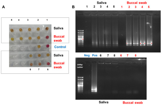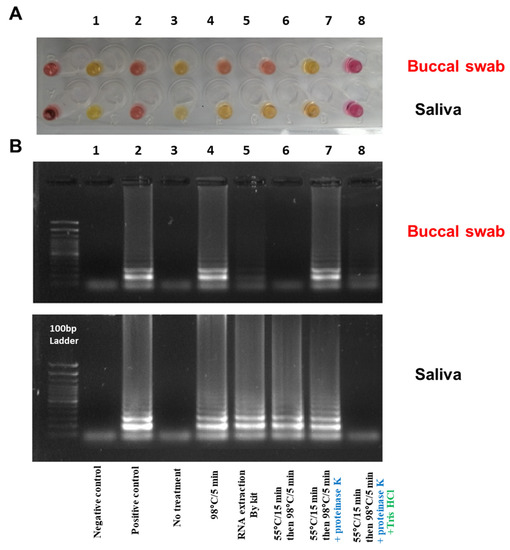 Optimizing RT-LAMP assay with different RNA extraction methods; (A) Using different extraction methods to show RT-LAMP on the RNAse P from the buccal swab and saliva sample; (B) Gel electrophoresis for the RT-LAMP assay resulted from A. Tube number (1) negative control (water), (2) positive control (RNA from COVID-19 patient), (3) sample without treatment, (4) RNA extraction by kit method (Monarch Total RNA miniprep Kit from NEB), (5) heat treatment for the sample at 98 °C for 5 min, (6) heat treatment for the sample at 55 °C for 15 min then 98 °C for 5 min, (7) heat treatment for the sample at 55 °C for 15 min then 98 °C for 5 min with proteinase K, (8) heat treatment for the sample at 55 °C for 15 min then 98 °C for 5 min with proteinase K in Tris HCl buffer. The reaction was incubated in a heat block at 65 °C for 30 min. The pink color indicated a negative reaction, while the yellow indicated a positive one.