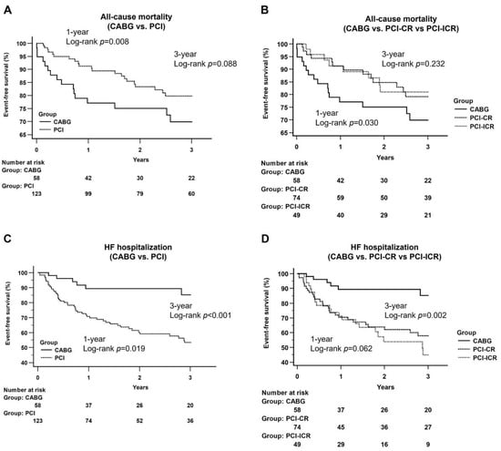 Kaplan–Meier curves of all-cause mortality and heart failure hospitalization between groups. (A) CABG vs. PCI: A higher incidence of all-cause mortality was noted at the one-year follow-up period (log-rank p = 0.008) and did not differ at the three-year follow-up period (log-rank p = 0.088); (B) CABG vs. PCI-CR vs. PCI-ICR: CABG group had a higher incidence of all-cause mortality at the one-year follow-up period (log-rank p = 0.030), and no significant difference was noted at the three-year follow-up period (log-rank p = 0.232). Abbreviation: CABG: coronary artery bypass grafting; PCI: percutaneous coronary intervention; CR: complete revascularization; ICR: incomplete revascularization; (C) CABG vs. PCI: CABG group had a lower incidence of HF hospitalization at one-year follow-up period (log-rank p = 0.019) and three-year follow-up period (log-rank p < 0.001); (D) CABG vs. PCI-CR vs. PCI-ICR: there was no significant difference at the one-year follow-up period (log-rank p = 0.062) and CABG group had a significantly lower incidence of HF hospitalization at three-year follow-up period (log-rank p = 0.002).