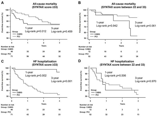 Kaplan–Meier curves of all-cause mortality and heart failure hospitalization at follow-up period between CABG and PCI groups by a different range of SYNTAX score. (A) CABG vs. PCI (SYNTAX score ≥ 33): A better survival outcome was noted at the one-year follow-up period (log-rank p = 0.012) and did not differ at the three-year follow-up period between CABG and PCI groups (log-rank p = 0.459); (B) CABG vs. PCI (SYNTAX score between 22 and 33): There was no significant difference at the one-year and three-year follow-up period between CABG and PCI groups.; (C) CABG vs. PCI (SYNTAX score ≥ 33): CABG group had a significantly lower incidence of HF hospitalization at the one-year (log-rank p = 0.002) and three-year (log-rank p < 0.001) follow-up period; (D) CABG vs. PCI (SYNTAX score between 22 and 33): There was no significant difference at the one-year and three-year follow-up period between CABG and PCI groups.