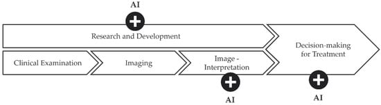 In the age of digitalization, where AI is applied in many fields of daily life, medicine is a field that has yet to make up the leeway. Although AI applications in medicine are increasing, most X-ray images are still assessed manually with narrative image descriptions [,,]. AI in healthcare has the potential to create new methods to reduce the steadily increasing workload of clinicians, while also improving research and development, and recognizing underlying patterns that otherwise could not be recognized []. As there is always a risk of error when diagnosing radiographs, manually assessing them under severe and urgent conditions can elevate that risk to 40% or more []. As computers are not affected by their surroundings or stress, the performance of AI stays more consistent.