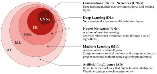 Machine learning (ML) is part of the field of AI (Figure 3), which is based on algorithms that describe the relationships between variables. In conventional statistical analyses, the goal is to find inferences by understanding the relationships between variables to reach conclusions or make predictions, based on the collected data. Data that is collected through the conversion of medical images, a process called radiomics, contains information on underlying pathophysiologies that can only be revealed by quantitative image analysis []. One of the advantages of ML is that it can formulate hypotheses based on the collected data, with only occasional input from humans, making it flexible. That flexibility, however, can also be a weakness []. While the primary goal of ML is to make predictions, in contrast to linear or logistic regression, the accuracy of the prediction or the “what” is more important than understanding the way or the “how” of reaching it, e.g., understanding the relationships of pixels of an X-ray is not important as long as the diagnosis of a fracture is correct []. Although this “black box” nature of ML models potentially offers more accurate performance in prediction, it comes with the cost of less understanding of the impact that variables might have on the outcome, making it more difficult to pinpoint the exact problems needed to treat [].
