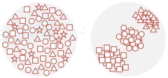 Illustration describing the mechanism of clusterization: In the left image, no specific order can be seen. For clusterization, different shapes are recognized and organized in a group (cluster) as seen in the right image. Shapes that do not belong in any group (e.g., stars) are sorted out. This can help ML models to recognize patterns that would otherwise be difficult to recognize.