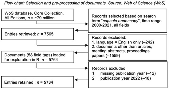 A search was performed in the Web of Science Core Collections (WoSCC) database with the keywords “capsule AND endoscopy” to create a relevant subset regarding the research area of interest. Out of the returned content of 7565 documents, only English-language papers, meeting abstracts, and proceedings papers were selected, with a remaining total of 5764 publications for the time span from 1 January 2000 to 31 December 2021. For all 5764 documents, a full bibliometric record, including cited references (58 field tags), was downloaded on 4 April 2022 (Figure 1).