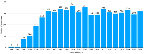 With a second analysis (see Figure S2)—in form of a grouped display of the bibliographic data into four subsets for the periods from 2000–2005, 2006–2010, 2011–2015, and 2016–2021—we provide an alternative approach to showcase the topic’s evolution over time.