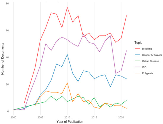 The distribution over time for publications with reference to a selection of conditions/diseases is shown in Figure 3: Bleeding (n = 1105), Cancer and Tumors (n = 455), Celiac Disease (n = 132), Inflammatory Bowel Disease (IBD, n = 838), and Polyposis (n = 148) in our dataset of 5734 documents.