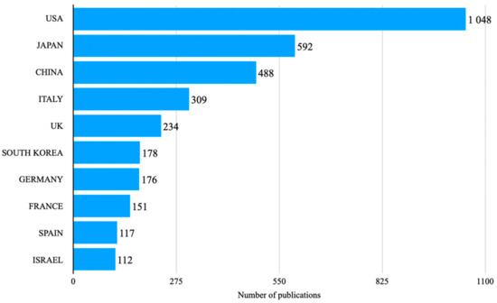 Our dataset includes contributions from 64 different countries measured by the first authors’ countries of origin with 1385 documents not specifying a first author and/or a first author’s country of origin and from 83 countries measured by the corresponding authors. According to the count based on first authors, most publications originated in the United States of America (n = 1048), followed by Japan (n = 592), China (n = 488), Italy (n = 309), United Kingdom (n = 234), Korea (n = 178), Germany (n = 176), France (n = 151), Spain (n = 117), and Israel (n= 112). Corresponding authors top 10 countries of origin included: USA (n = 1229), Japan (n = 585), United Kingdom (n = 461), Italy (n = 437), China (n = 436), Germany (n = 230), Korea (n = 186), France (n = 177), Israel (n = 173), and Spain (n = 171), Figure 4.