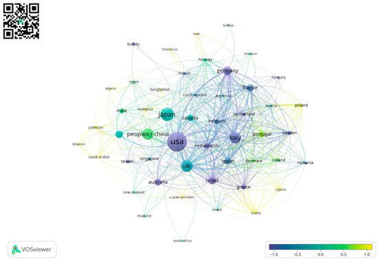 Country collaboration map. Note: Layout settings VOSviewer: Attraction = 2; Repulsion = −2; Resolution = 1; minimal Cluster size = 1. Legend shows standard normal distribution of average publication year per country. The visualization is available online at https://tinyurl.com/y6ofc5jd.