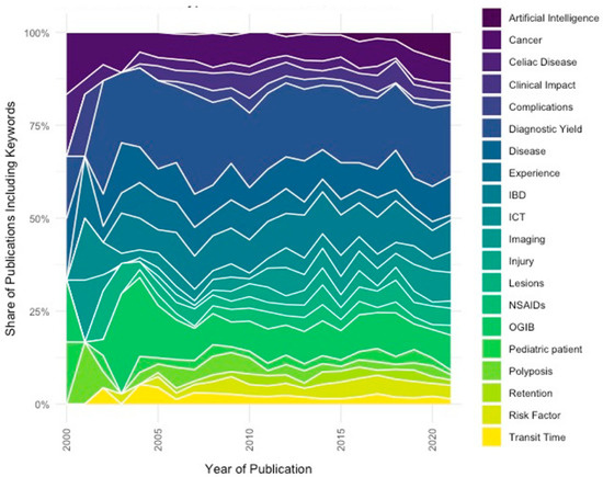 The analysis of topics (based on keywords) also provided interesting insights. The game-changer in CE over the last decade has been the introduction of increasingly advanced AI, as witnessed by the steady rise in Figure 6. Deep learning and convolutional neural networks can help to optimize the weaknesses of CE, which is the lengthy and tiring reading of lots of images, its harmonized classification and also localization [17,18].