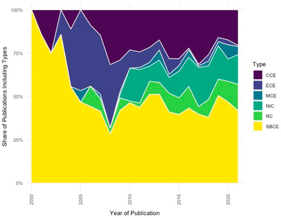 The co-occurrence analysis (method: full counting) in VOSviewer initially returned 7957 keywords. These were listed in descending order of frequency and labeled as either specific or non-specific to CE research based on our thesaurus file. A total of 84 terms with a minimum occurrence of 15 times remained after the exclusion of general terms, disambiguation of spelling variations, and after grouping, terms under shared meta-labels/semantic units. In Figure 6, the distribution over the years of publications including these keywords is put on display. For visualizing the evolution of keywords in publications over time, we extracted the keyword-specific documents based on the WoSCC field tags author keywords and keywords plus from our core dataset.