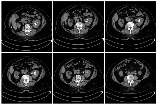 Axial plane images of abdominal and pelvic CT scan without contrast showing multiple pyelic, calyceal, and ureteral calcifications specific to encrusted uretero-pyelitis.
