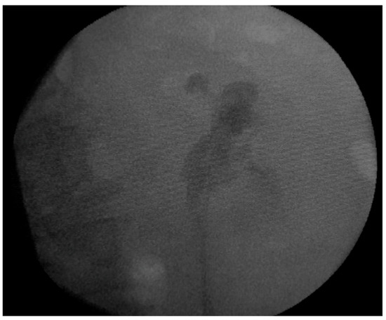 Considering the initial negative urine culture, the high values of the urinary pH, and the presence of the uretero-pelvic calcifications, we thought about a possible infection with Corynebacterium urealyticum. Three days after hospital admission, a new urine sample was collected. The cytobacteriological examination of the urine (CBEU) revealed >105 CFU/mL Corynebacterium urealyticum. Urine culture was performed on Columbia blood agar and chromogenic media, with a 48 h incubation period at 35–37 °C; identification was performed using matrix-assisted laser desorption/ionization—time-of-flight mass spectrometry (MALDI-TOF, Brucker Daltonics, Billerica, MA, USA). Disk diffusion antimicrobial susceptibility testing using the breakpoints of the European Committee on Antimicrobial Susceptibility Testing (EUCAST) showed susceptibility to fluoroquinolones and glycopeptides.
