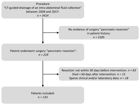 We performed a database search of the Radiology Information System (RIS) for the specific procedure key “CT guided drainage of an intraabdominal fluid collection”. A subsequent full-text search of the corresponding written reports as well as the operations and procedure codes (OPS) of the Hospital Information System (HIS) indicated previous pancreatic resections. We evaluated patients with postoperative fluid collections who had undergone pancreatic resection between 2004 and 2017 and received percutaneous low-milliampere CT fluoroscopy-guided drainage during a maximum postoperative period of 30 days. For reasons of homogeneity of the patient collective, a minimum survival period of 60 days was set. Fifteen patients died before the end of the observation period. In all these cases a correlation between the intervention and death cause could be excluded. Details of the selection process are displayed in Figure 1.