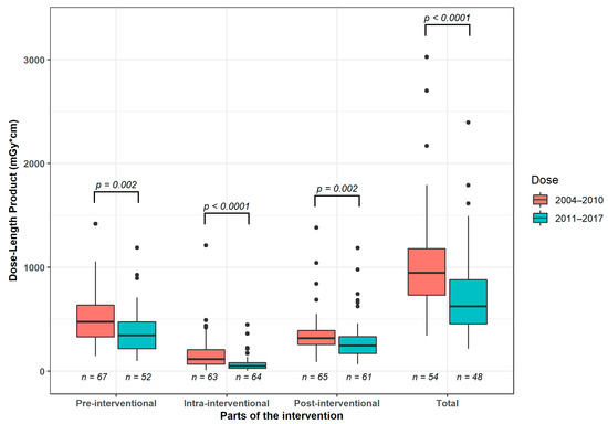 Median radiation dose between 2004–2010 and 2011–2017. Boxplots display elements of the interventional CT scan and the entire procedure.