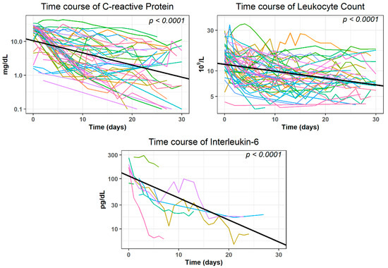 A statistically significant (p < 0.0001) decrease within 30 days after the intervention was observed in the time course of CRP, Leukocytes, and Interleukin-6 when analyzed with GLMMs in the subgroup of patients where no evidence of further surgical interventions or complications was given (n = 120 interventions). The covariate presence of POPF and proof of germs in the drainage fluid were statistically not significant (p > 0.220). They were excluded from further GLMM analysis (see Supplementary Table S2 for the results of the final regression models). The decrease of the log-transformed average values was as follows: −0.03593 mg/dL for CRP; −0.00807 × 109/L for Leukocytes and −0.04390 pg/dL for Interleukin-6 (Figure 6).