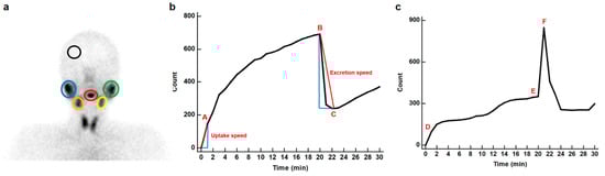 Examples of regions of interest (ROIs) on a salivary gland scintigraphy image (a) and time–activity curves of the salivary gland (b) and oral cavity (c) generated from salivary gland scintigraphy. (a) ROIs were manually drawn over each salivary gland (right parotid gland, blue oval; left parotid gland, green oval; right submandibular gland, orange oval; left submandibular gland, yellow oval), oral cavity (red oval), and background (black circle). (b) From the time–activity curve of the salivary gland, count at the end of the initial vascular perfusion phase (A), maximum count before stimulation (B), and minimum count after stimulation (C) were measured for calculating uptake ratio, maximum accumulation, and ejection fraction. Uptake speed was defined as count increment per second in the initial vascular perfusion phase, and excretion speed was defined as count decrement per second in the excretion phase. (c) From the time–activity curve of the oral cavity, count at the end of the initial vascular perfusion phase (D), maximum count before stimulation (E), and maximum count after stimulation (F) were measured for calculating pre-stimulatory oral activity and post-stimulatory oral activity.