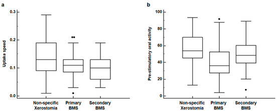 Distribution of uptake speed of left submandibular gland (a) and pre-stimulatory oral activity (b) in patients with non-specific xerostomia, primary burning mouth syndrome (BMS), and secondary BMS (black dots: an outside value which is larger than the 75 percentile value plus 1.5 times the interquartile range or smaller than the 25 percentile value minus 1.5 times the interquartile range).