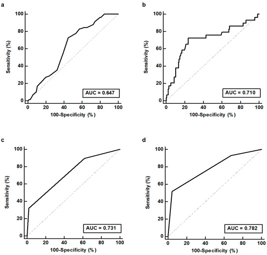 The diagnostic abilities of salivary gland scintigraphy for detecting BMS (both primary and secondary forms) and primary BMS were assessed based on ROC curve analysis (Table 2). Among salivary gland scintigraphy parameters, the uptake speed in the left submandibular gland showed the highest AUC value (0.647; 95% CI, 0.568–0.711) for detecting patients with BMS (Figure 3a). Using an optimal cutoff value of 0.14, the uptake speed in the left submandibular gland showed a sensitivity of 83.1% (95% CI, 71.0–91.6%), a specificity of 42.9% (95% CI, 33.2–52.9%), a positive predictive value of 45.0% (95% CI, 40.0–50.0%), and a negative predictive value of 81.8% (95% CI, 71.0–89.2%). For detecting patients with primary BMS, pre-stimulatory oral activity revealed the highest AUC value (0.710; 95% CI, 0.634–0.778) among parameters (Figure 3b). Using a cutoff value of 41.5, pre-stimulatory oral activity showed a sensitivity of 72.4% (95% CI, 52.8–87.3%), a specificity of 76.3% (95% CI, 68.2–83.2%), a positive predictive value of 39.6% (95% CI, 31.0–48.9%), and a negative predictive value of 92.8% (95% CI, 87.6–95.9%).