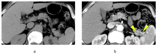 A 68-year-old man consulted a practitioner with a complaint of weight loss. Abdominal US examination showed no abnormal findings. The patient had a history of diabetes mellitus and smoking, which are risk factors for pancreatic cancer; thus, CA19-9, Span-1, and DUPAN2 levels were evaluated, revealing elevated values. The attending practitioner referred the patient to a general hospital for further examination. Plain abdominal CT scan showed no notable findings (Figure 3a), although a dynamic CT scan showed a mass with a major axis of 10 mm, which had a poor contrast effect in the tail of the pancreas (Figure 3b). The patient was diagnosed with pancreatic cancer.