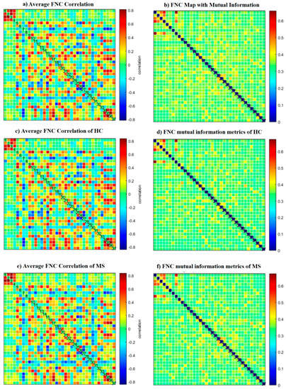(a) Static functional network connectivity correlations were computed for each averaged across sessions. (b) FNC metrics of component spatial maps. Mutual information was computed between components and averaged across datasets. (c) Functional network connectivity correlations were computed for average HC dataset. (d) Mutual information was computed between components spatially for the HC dataset. (e) Functional network connectivity correlations we computed for the average MS dataset. (f) Mutual information was computed between components spatially for the MS dataset.