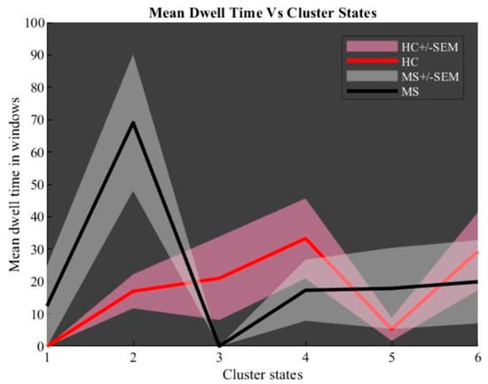 For each group, we constructed a dynamic connectivity map. At the first step, a chart of state vs. mean dwell time was determined and is shown in Figure 7. This chart proves that the second state is more reliable than other extracted states. Then, back-reconstruction of the second state for HC and MS groups was done and two-sample t-test results run (Figure 8).