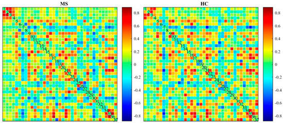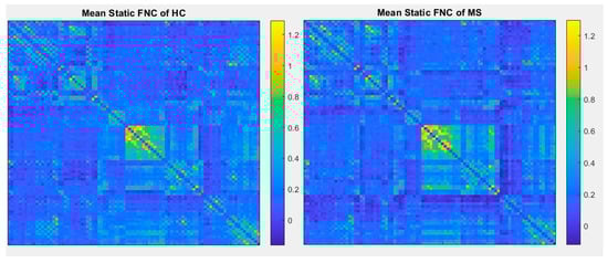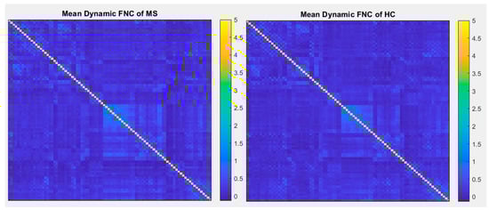 Mean dynamic FNC of both MS group and healthy control group using correlation with 90 brain regions defined by AAL atlas.