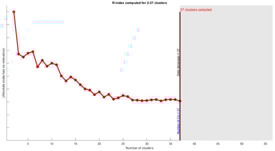 R-index computed for 2–37 cluster showing degree of difference between clusters. Most of the differences will occur for more than 32 clusters.