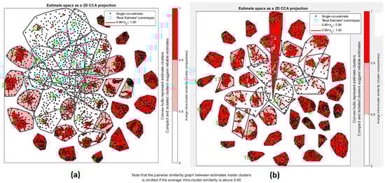 Estimated space as a 2D CCA projection for ICA repetition. Red color shown measure of correlation between clusters. (a) Measure of usual ICA based on bootstrapping dataset and repetition of ICA. (b) Proposed method of bootstrapping and repetition of ICA.