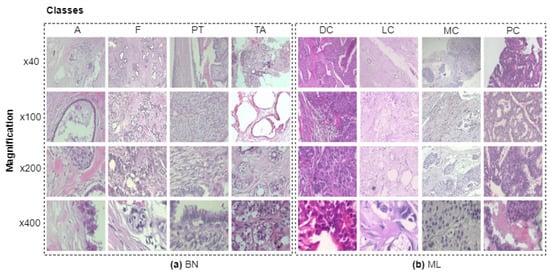 Han et al. [] used a structured deep learning model to perform breast cancer multi-classification from histopathological images, taking into account the different magnification levels of the benign and malignant images in the BreakHis dataset.