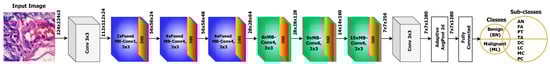 Finally, a final 3 × 3× convolution with and a fully connected (FC) layer is used to finalize the feature map to classify the input image as Benign (BN) or Malignant (ML), and also with the sub-types of BN (AN, FA, PT, and TA) and ML (DC, LC, MC, and PC), respectively.