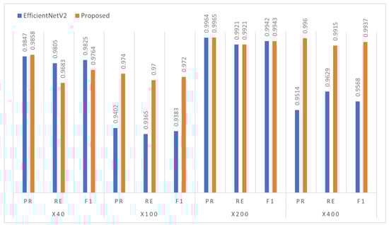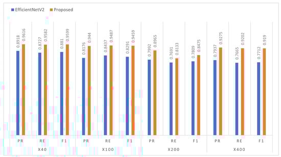 Illustration of the binary class classification performance achieved by the proposed model compared to the EfficientNetV2 network under multiple magnification settings.