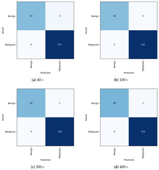 Illustration of the binary class confusion matrix obtained through the proposed model on the test set. Note that (a–d) refer to the , , , and magnifications, respectively.