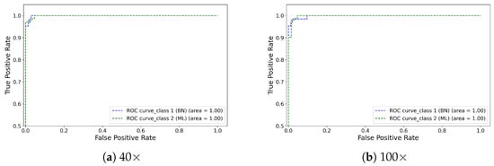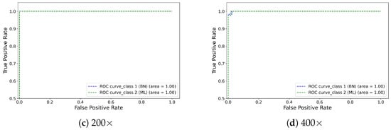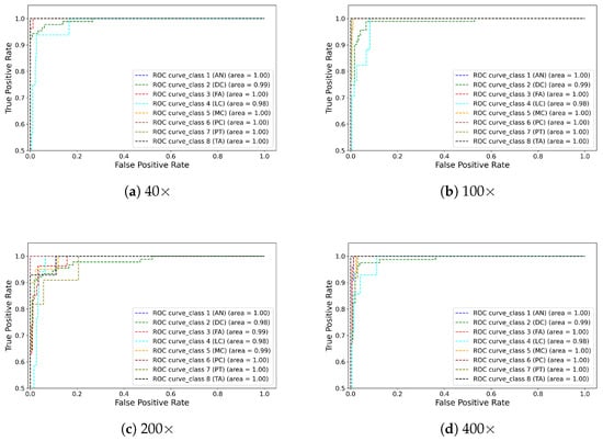 Illustration of the ROC curve obtained through the proposed model on the test set. Note that (a–d) refer to the , , , and magnifications, respectively.