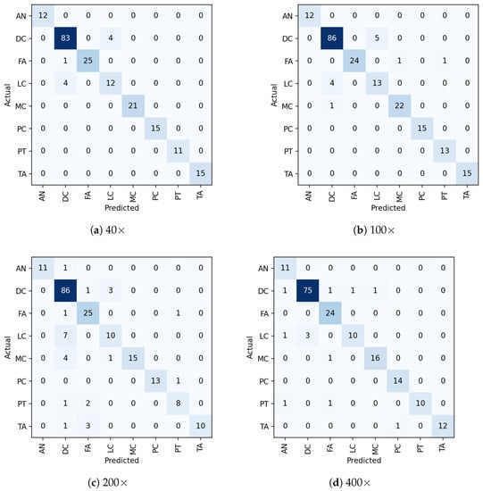 Illustration of multi-class confusion matrix obtained through the proposed model on the test set. Note that (a–d) refer to the , , , and magnifications, respectively.