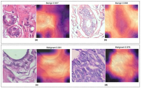 GradCam visualisation of the proposed model for -stained breast tumour patch examples of benign (a,b) and malignant (c,d) classes.