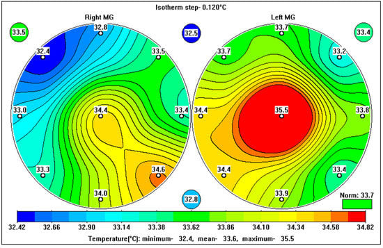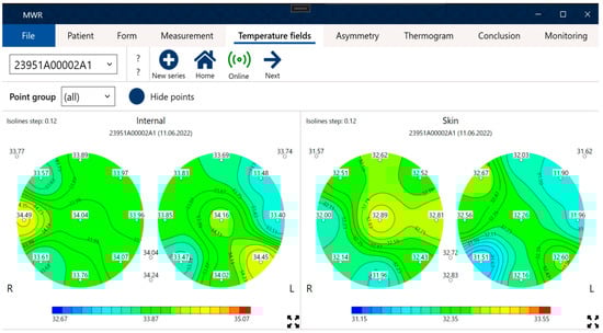 Using the MWR2020 device, internal and skin temperature measurements were conducted at 22 points (left and right breast). Control points are shown in Figure 1. The results were visualized (Figure 2) and stored in CSV data format for further analysis.